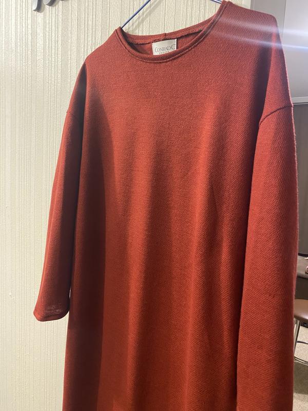 Сукня кольору стигла вишня в пол, прямого крою зі спущеним рукавом. Тканина вʼязана тепла, в складі є шерсть.