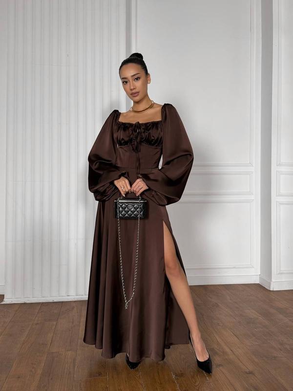 ❗️ 7 кольорів ❗️ сукня максі з розрізом шовк з довгим рукавам на грудях завʼязка