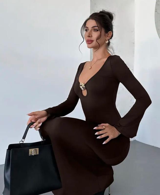 Элегантное женское платье шоколадного цвета. Очень хорошо тянется, ткань приятная к телу. Мне не понравился размер, велико. Платье идеально подойдет тем у кого объемные бедра, красиво сядет по фигуре.