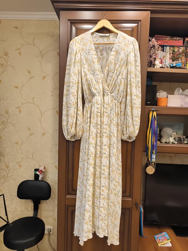 Сукня Нова, але без бірки. Рукава волани, на резинці. V-образний виріз, на поясі пезиночка. З підкладкою внизу. Тканина жатка полієстер.