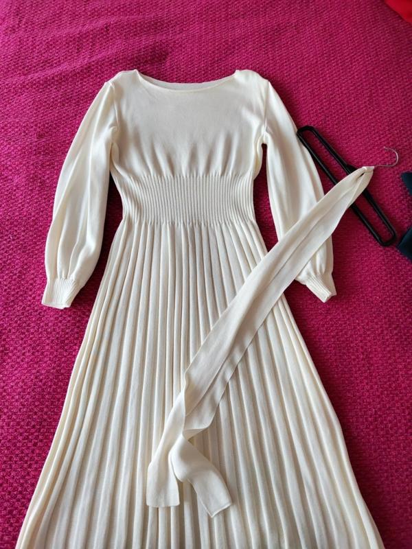 Трикотажное платье, молочного цвета.Стан нового. длина 115см ширина подмышками 45см нп.об. ризинка на талии в нерастянутом состоянии 30см