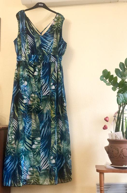 Сукня довга-145 см , під грудьми на широкій резинці , яка тягнеться від 38 до 48 см в ширину. V-образний виріз спереду і на спинці. На спинці ще є завʼязка, яка регулюється по бажанню. Між підмишками ширина 55 см. Бедра вільні- до 72 см в ширину. Є коротка чорна підкладка. Тканина поліестер. Не вдягалось. Сидить дуже красиво на фігурі- типу античного стилю. Розмір L указаний. Але і на М дуже круто сяде. Важливо!!!! В призначенні платежу писати - Компенсація вартості за вживану річ.