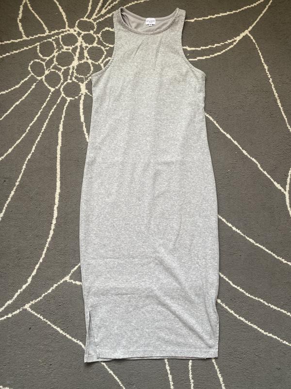 Платье миди в рубчик, серого цвета, снизу по бокам разрезы, размер ХС-С, длина 102.