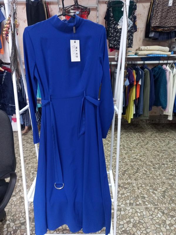 Длинное платье синего цвета (электрик) с воротничке стойка, с молнией сзади, отрезное по талии, юбка трапеция.С поясом.Ткань тоненькая.Замипы: об.гр.43см.,об.тал.38см.,длина 123см.