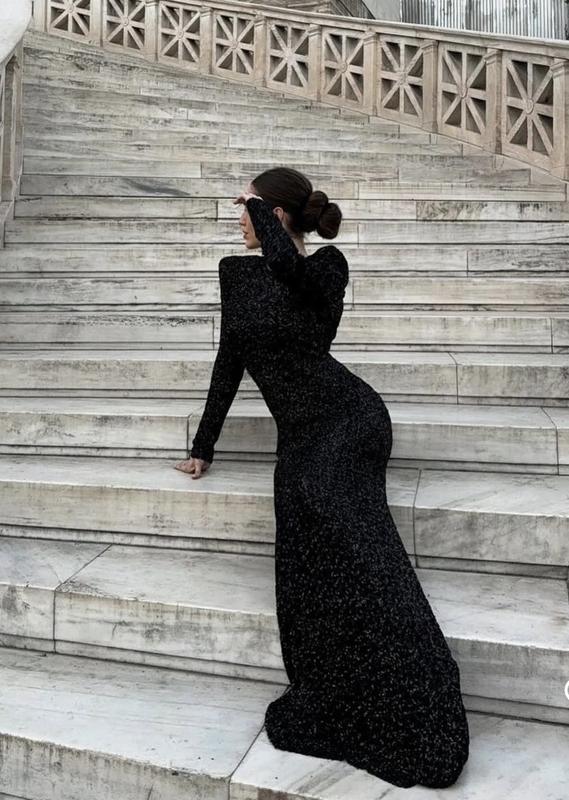 Довга сукня з круглим вирізом і довгими рукавами з підплічниками. З аплікаціями з паєток, відкритою спиною та застібкою на шиї. Оригінал В наявності M тягнеться Заміри М Плечі 37/44 Пог 44+ Талія 38+ Бедра 50+ Довжина 142 Рукав 68