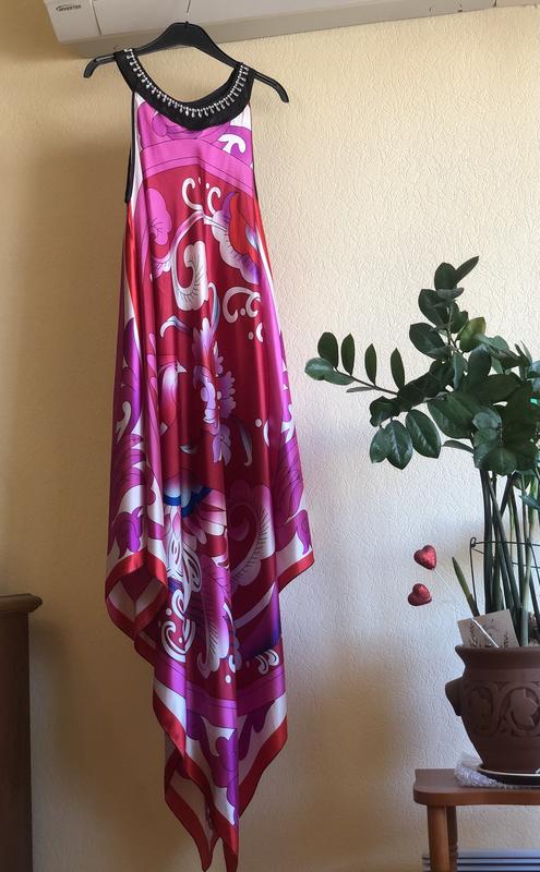 Дуже гарна сукня із сатину яркого кольору, асиметричного крою. Два великих полотна. Довжина від 87 см по бокам до 145 см посередині. ПОГ 54 см; далі до низу- вільно. Одягалося один раз вдома.