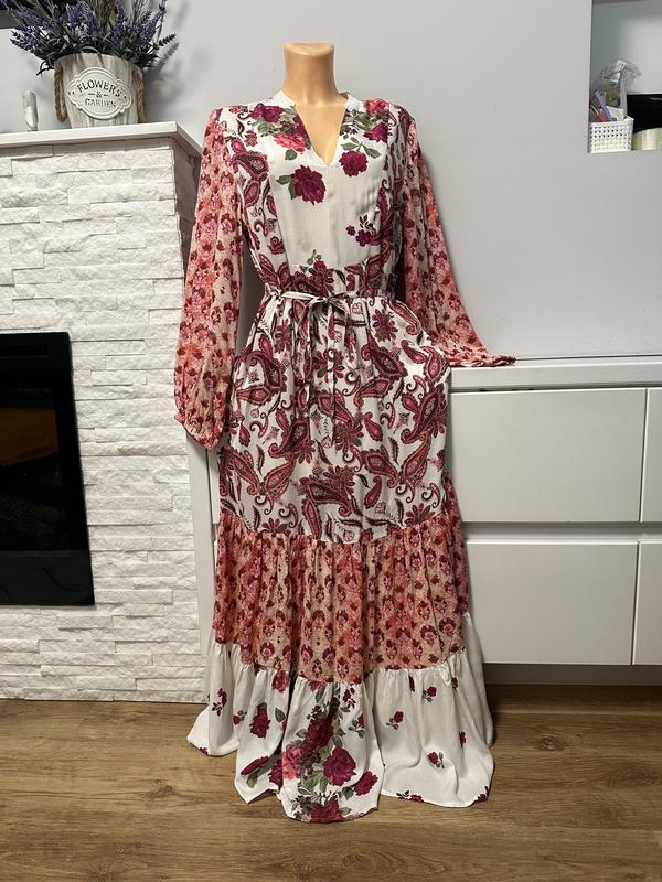 Это шикарное платье имеет следующие параметры: • Размер: L-XL • Длина: 145 см • Обхват груди: 54 см • Талия: 53 см • Стегна: 59 см Модель выполнена в стильном сочетании цветочного и восточного узора, имеет длинные рукава и пояс на талии, подчеркивающий фигуру. Выглядит очень элегантно и женственно. Не забудьте подписаться на мой профиль,тут всегда можно найти большой выбор одежды, обновление практически каждый день и действуют еженедельные скидки 👗🌹🤗