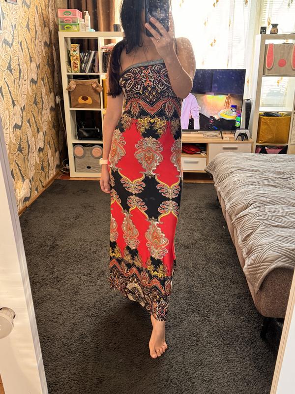 Длина 120 см, талия на резинке тянется до 42 см , так же и на груди, хорошо сидит не спадает, очень приятная ткань к телу, охлаждающая , состояние идеальное