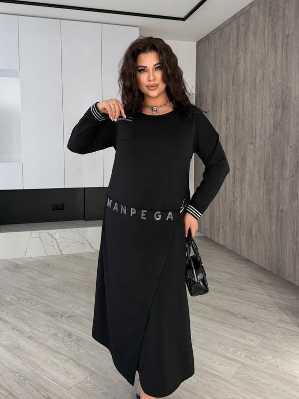 🔥🔥🔥 НОВИНКА 🔥🔥🔥 Платье Модель 1295 Платье с имитацией юбки на запах Застёжка на боку металлический карабин+металл полукольцо Впереди на ленте стразы Карман рабочий отделка стразы Манжет резинка серебро люрекс Ткань 2 х нитка трикотаж Цвет чёрный Размеры 48-50.52-54 56-58