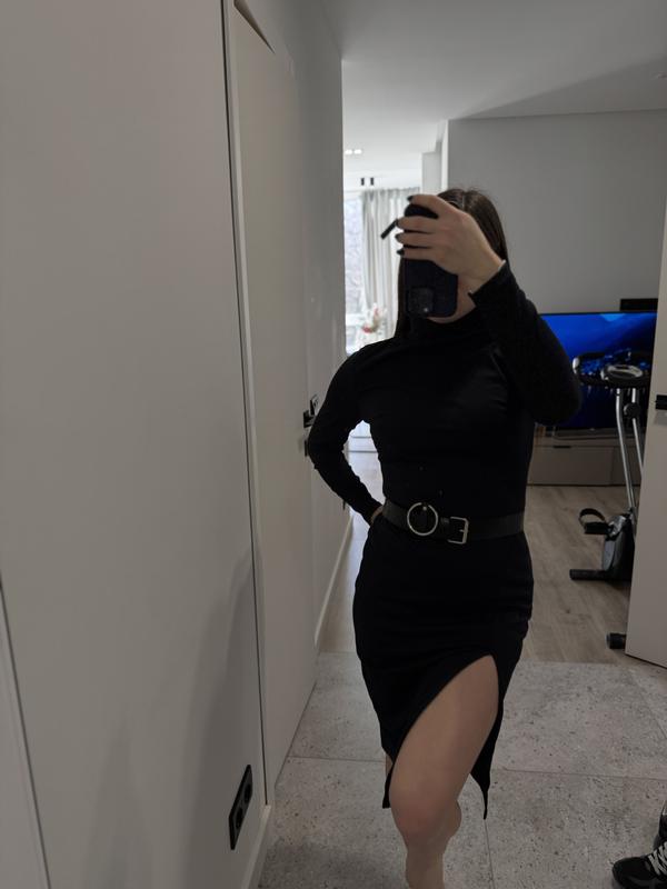 Черное платье с разрезом на ноге, красиво садится по фигуре, РЕМЕНЬ В КОМПЛЕКТЕ