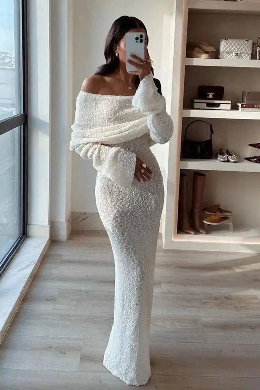 Это платье - нежное, элегантное и воздушное, словно рафало Арт 270 Ткань: нежное букле Размеры: 42-46 Цвета: молочный Элегантное, длинное платье из нежного трикотажа букле, окутывающего фигуру изящным силуэтом. Глубокое декольте на плечах добавляет женственности и изысканности, а длинные рукава с расширением придают образу легкость и романтичность. Сдержанный, но эффектный дизайн подчеркивает утонченность стиля и идеально подходит для особых моментов