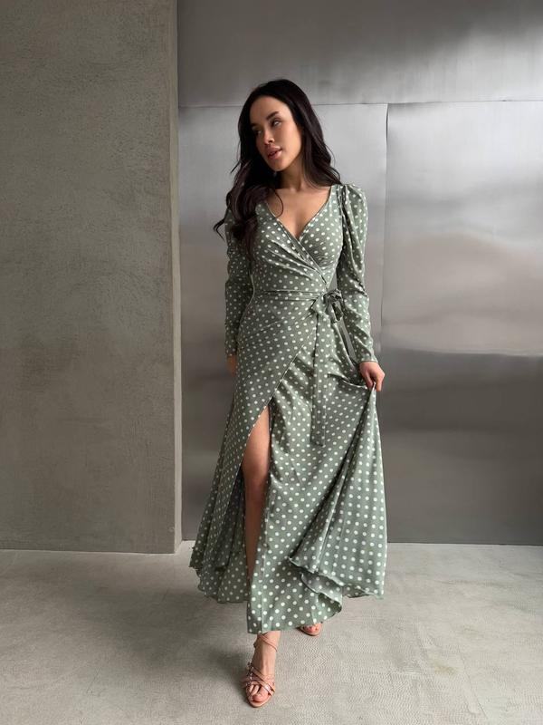 Женское платье платье на запах в горошек ретро стиле длинное макси с рукавами повседневное...