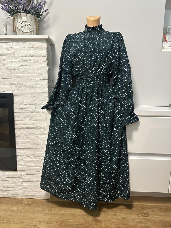 платье темно-зеленого цвета в белый мелкий горошек. Она имеет длинные объемные рукава с манжетами на резинке, высокую горловину с небольшим рюшами и эластичный пояс, с резинок который подчеркивает талию. Длина платья - 125 см, объем груди - 51 см, талия на резинке, а бедра свободного кроя. Это стильная и удобная модель, которая подходит для повседневной носки или особых случаев. Не забудьте подписаться на мой профиль,тут всегда можно найти большой выбор одежды, обновление каждую неделю и действуют всегда скидки