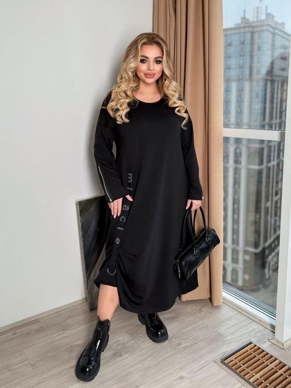 ⬆️Платье. Модель 1291❤️459 Ткань 2 х нитка трикотаж Цвет черный На рукавах змейки украшения Перед платья драпирован Отделка лента со стразами+полукольцо цвет серебро ( металлическое) Размеры 48-50 52-54 56-58 ЗАМЕРЫ Модель 1291 Размер 48-50 О гр 120 Об.б 124 Дл рукава от шеи 69 Дл изделия 130 Размер 52-54 Огрубое 124 Об бы 128 Дл рукава от шеи 71 Дл изделия 132 Размер 56-58 О гр 130 Об б 140 Дл рукава от шеи 72 Дл изделия 134
