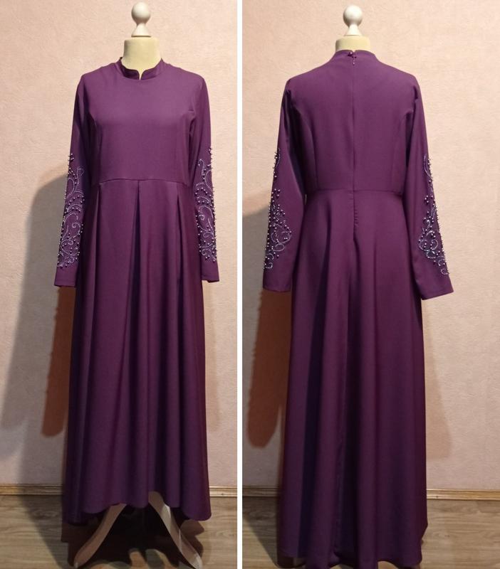 Нарядное платье в пол с вышивкой, бренд Moda Selvim (Турция). Красиво струящееся платье в пол имеет романтичный приталенный силует, расширенный книзу и удлиненный сзади. Платье сшито из мягкой и эластичной трикотажной ткани красивого темно-лилового цвета. В составе ткани есть 30% хлопка. Рукава платья украшены вышивкой, бусинами и стразами. Очень красиво ложиться юбка платья. Передние складки придают платью богатство ткани. В этом платье Вы будете себя чувствовать неотразимой. Размер 52-54. Длина 128-160 см. Длина рукава 62 см. Полуобхват груди 55 см. Полуобхват талии 45 см. Полуобхват бедер 85 см.