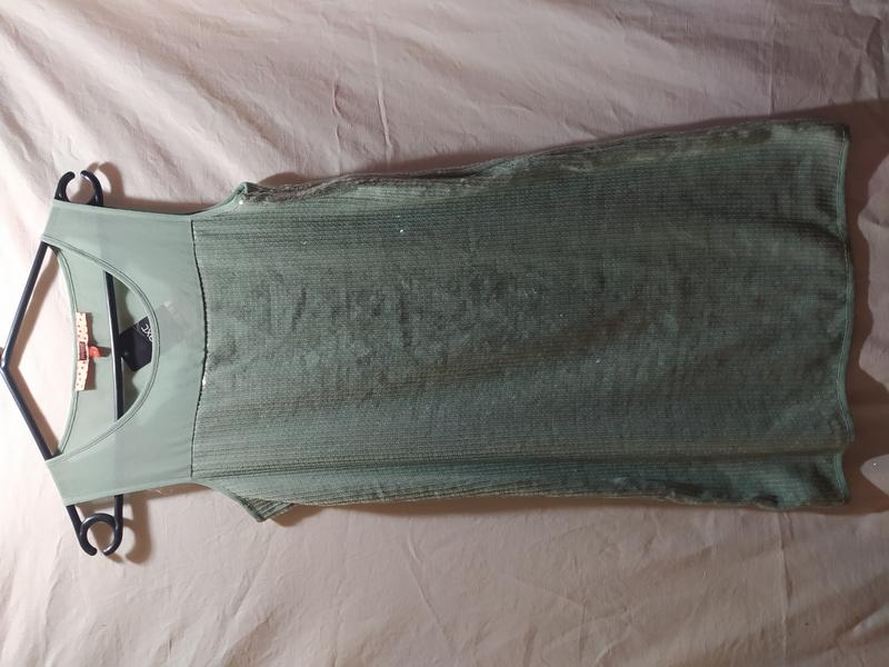 Украшенная пайетками, красивый мятно-зеленый цвет, имеет полиэстеровый материал, по размеру S, в груди(41см), длина платья(90см)