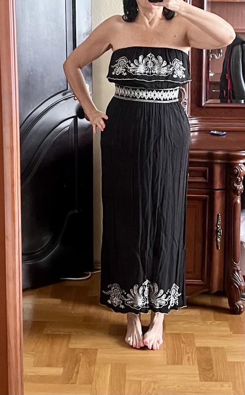 Літня легка довга сукня з відкритими плечима. На струнку дівчину/жінку. Заміри на фото. ПОГ на резинці- тягнеться до 53 см точно. І під груддю (там де вишивка) тягнеться до 43 см. Низ вільно. Надягала 2 рази. Важливо!!!! В призначенні платежу писати - Компенсація вартості за вживану річ.