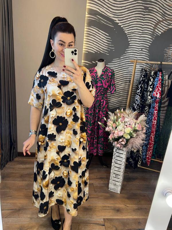 идеальное сочетание комфорта, красоты и удобства в прекрасном летнем платье свободного кроя с короткими рукавами, практичными карманами по боковым швам, эффектной длиной меди, выполненной из приятного к телу коттона с эластаном с невероятно красивым принтом размеры 50, 54 длина 120-122 см, объем груди по изделию 114 и 122 см, длина рукава от шеи 38 см код L 66