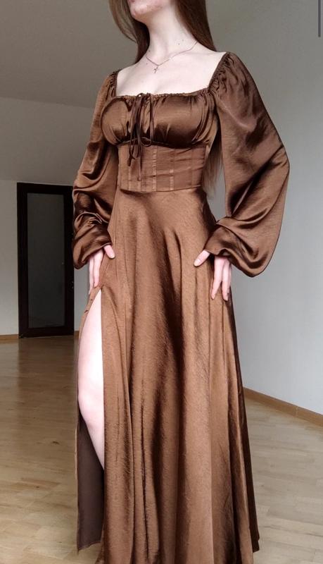 Платье коричневого цвета, размер XS, состояние новый/идеальный, еще с биркой. Жодного разу не одягла. Длина - 128 см. Модель на фото имеет рост 170
