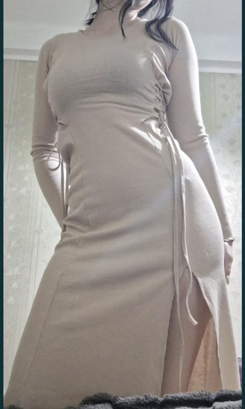 женское длинное платье бежевого оттенка, из мягкой ткани, с завязками.