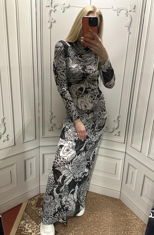 Дуже гарна довга сукня сіточка класної якості Гарно тягнеться довжина від плеча 149 сантиметрів довжина рукава від плечового шва 61 ширина плечей 36 ширина в грудях спокійному стані від пройми до пройми рук 38 сантиметрів ширина в талії в спокійному стані 32 сантиметри ширина в бедрах спокійному стані 46 сантиметрів
