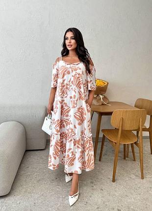 Платье трапеция с карманами 🤑Модель: 69 🤑Фото и видео реал 🤑Размер: 50-52, 54-56, 58-60, 62-64 🤑Цена: 1380грн 🤑Тканина: софт 🤑Цвет: бежевый с черным, белый с бежевый, черный в горох Легкое и женственное платье свободного кроя с изысканным принтом. Детали платья: – свободный крой, обеспечивающий комфорт и легкость в движении. – Открытые плечи с приспущенными рукавами, придающими романтичность. – Декоративная оборка по низу, придающая легкость и динамичность силуэта. – длина миди, идеально подходящая как для повседневных, так и для более нарядных выходов. Это платье - отличный выбор для теплых летних дней и особых случаев. .