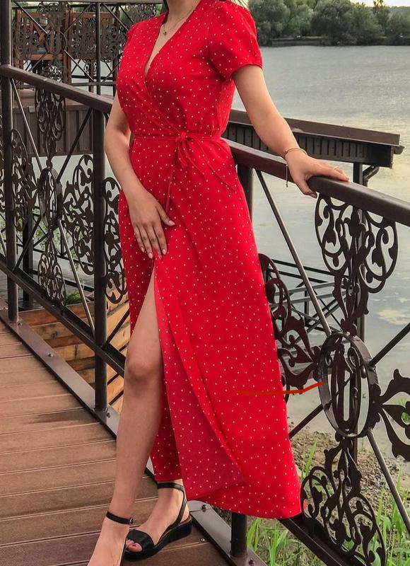 Красное длинное платье в горошек на запах, невероятно ложится по фигуре. Яркий красивый цвет, приятный материал.