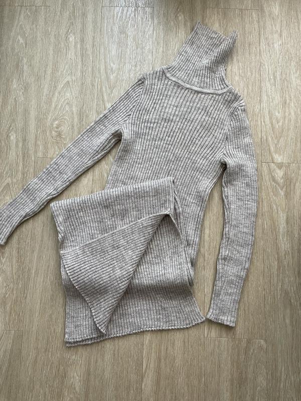 Вязаное платье миди (на рост 175 см), в рубчик, серо-бежевого цвета. Хорошо тянется, поэтому может подойти, как от S до L