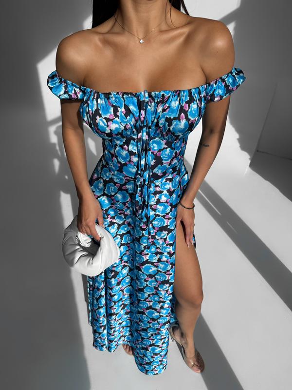 Длинное шелковое платье макси с разрезом в цветочный принт, платье макси с открытыми плеча...