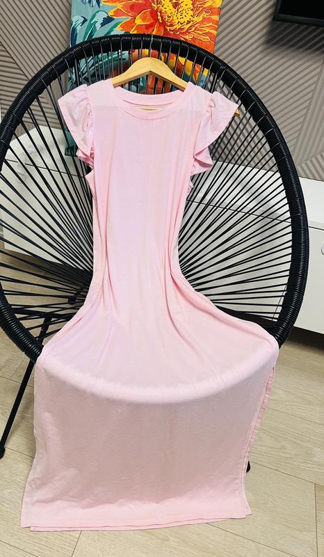 Нежное длинное розовое платье. По бокам разрезы. На плечах милые крылья. Размер M