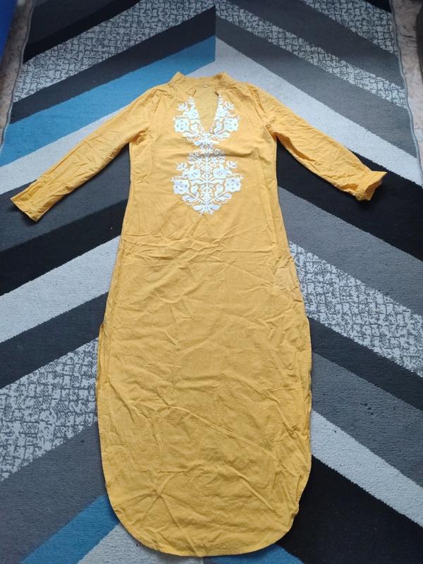 Сукня в підлогу,до коліна по обох боках розрізи,гарний колір,довжина 140 см,груди 50 см,талія 46 см,бедра 53 см,трішки тягнеться,по бірці ХЛ,але маломірить на М,Л