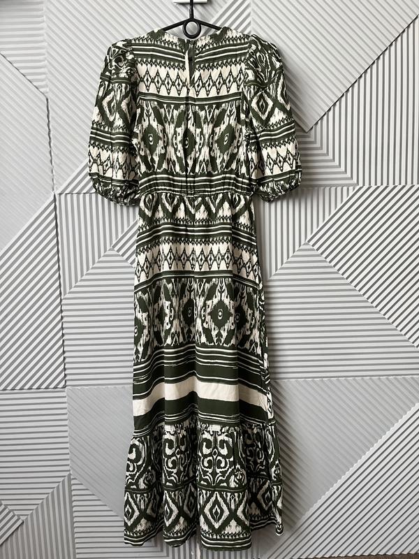 Розмір по бірці 6/34 XS можна й на S Без дефектів Дуже приємна тканина (холодить) Склад тканини 100 % віскоза Красиві волани Рукав ліхтарик, на резинці Довжина 124 см Довжина від пояса - 85 см Пояс резинка 29 см + тягнеться до 44 см в обхваті талія висока , гарно видовжує силует Рукав 36 см , резинкою можна коригувати висоту Плечі 29 см + тягнеться ПОГ 44 см ( на бюст 85 см) ПОБ 56 см в розкладеному вигляді Внизу багато тканини