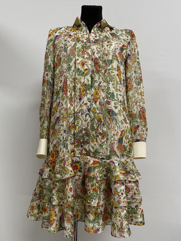 Ця сукні -витвір мистецтва! дуже незвичайна! На сайті 490 євро 💶 Стан нової речі Розмір XS-S. склад 88% шовк, 12% металізоване волокно, підклад поліестер Плече-плече 40см ПОГ 48 см По спинці 95см