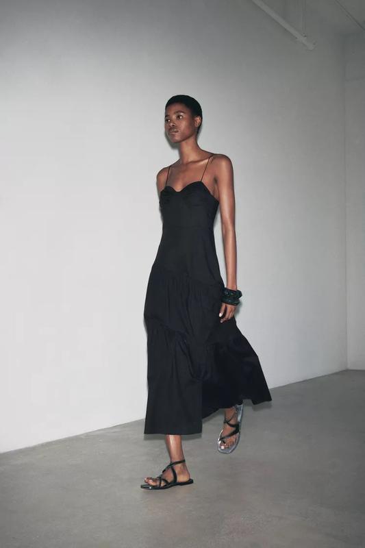 Длинное платье из штапельного хлопка. Вырез в виде сердца и тонкие завязывающиеся бретели с возможностью регулировки. Жата еластична тканина ззаду. Панельный низ. Скрытая молния. Добавить больше ЧЕРНЫЙ | 5289/041/800