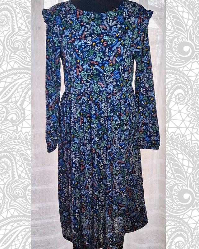 Платье длинное в стиле бохо с мелким флористическим узором на темно-синем фоне. Платье невероятно удобное, размер 12, бренд TU, собранное по талии, с длинной юбкой, на плечах - маленькие крылышки, рукава свободные на резинке. Замеры полуоборота: Плечи 41, Грудь 46, Талия 44, До талии 36, Длина юбки 78, Рукав 62. Состав: 98% полиэстер, 2% эластан Состояние новое без бирки. Отдам при 420 грн.