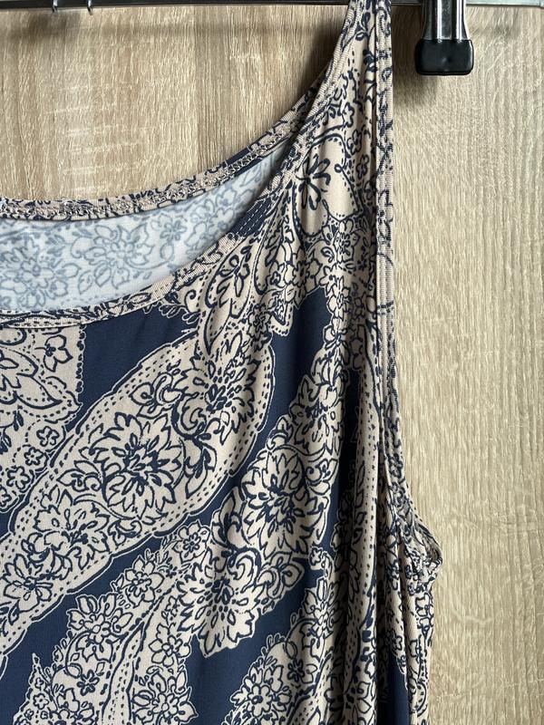 90 вискоза, 10 эластан. Красиво тянется, На кремовой основе рисунок темно- синего цвета. L, XL. Ог 50, если растянуть- 55. К низу немного расширяется-55, снизу немного разрез. Я начинала использовать как ночную рубашку, потому что вискоза холодит. Длина 130