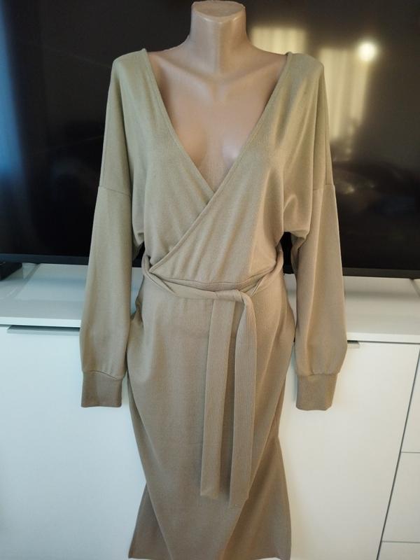 Трикотажное платье,бежевого цвета, с декольте и вырезом на спинке,рукав длинный, длина до середины листки, с разрезом сбоку,стан идеально