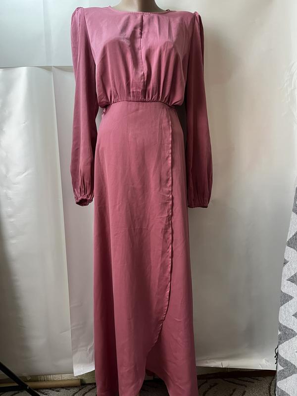 Платье сатиновое на запах внизу, талия красиво подчеркивается поясом. ПОГ 54, ПОТ 42. Длина 134. Недолік на фото. Очень красиво подчеркивает фигуру