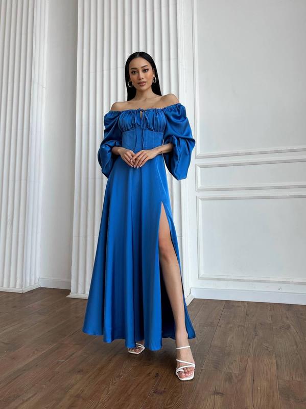Сатиновое длинное платье с длинными пышными рукавами и свободной юбкой