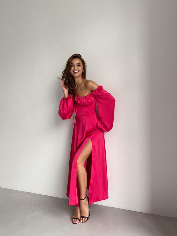 Сатиновое длинное платье со свободной юбкой с разрезом