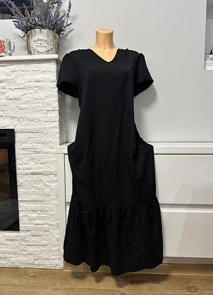 Это базовое черное платье простого кроя, идеальное для ежедневного использования или как основа для создания различных образов. Модель имеет короткие рукава, V-образный вырез горловины и аккуратную оборку снизу, что добавляет немного женственности. Также заметны удобные карманы по бокам. • Сукня базова • Размер: 14 (XL) • Длина: 120 см • Объем груди (ПОГ): 53 см • Талия: 54 см • Стегна: 58 см Не забудьте подписаться на мой профиль,тут всегда можно найти большой выбор одежды, обновление каждую неделю и действуют всегда скидки