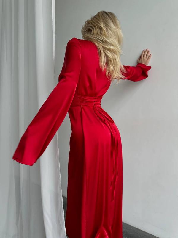 Жіноча червона шовкова яскрава сукня максі з шнурівкою на спинці