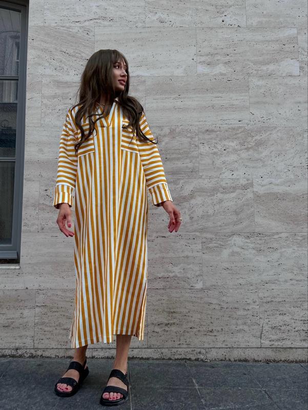 Жіноча сукня сорочка гірчична літня в смужку з довгим рукавом максі довга