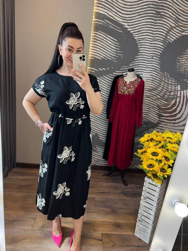 легкое и комфортное платье миди с круглым вырезом, небольшими короткими рукавами, удобным вшитым поясом, карманами и разрезами по боковым швам, она выполнена из дышащего коттона беспроигрышного черного цвета, украшенного белой цветочной вышивкой платье легко садится на девушек с разными типами фигур, скрывая возможные недостатки и подчеркивая достоинства, оно идеально впишется в ваш летний гардероб размеры: 50, 52, 54, 56, 58 в зависимости от размера длина 126-128, объем груди по изделию 110 +4 до 126 см, длина рукава 23-25 см код LR6435G-25
