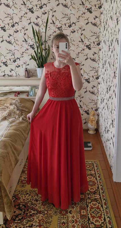Длинное платье, очень красивое насыщенного красного цвета. Верх сеточка и гипюр низ шифоновая юбка, под низом атласный подклад, не просвечивается. В комлекті поясок. Надевала один раз на свадьбу. Размер М. Мои настройки 90, 65, 94, талия и бедра могут быть больше, на рост 170 см плюс каблук 10 см. С дефектов не хватает 2 камучика. не заметно.Купила по 2000, отдам символично 800