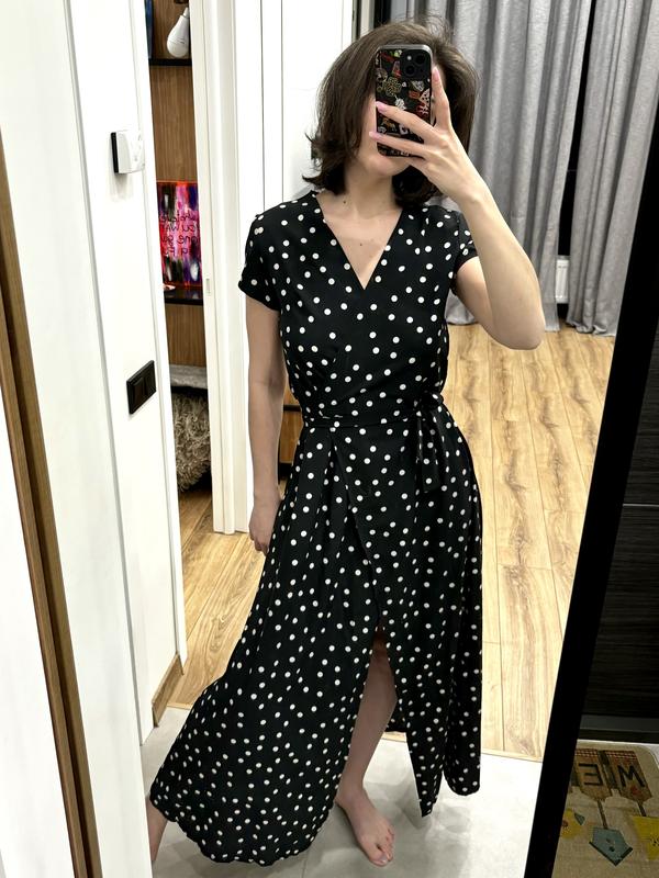 Меди-платье на запах в горох. Есть затёртость на декольте, но это совсем незаметно при носке. Очень легкая.