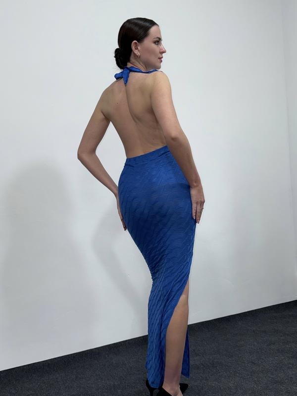 Синее платье с открытой спинкой с разрезом на ножке