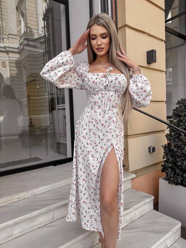 Ніжна та дуже легка літня сукня : грудь затягується на затяжці; спинка затягується на шнурівці, рукав довгий на резинці , спідниця розкльошена з розрізом; У цій сукні кожна дівчина буде неперевершеною 🌺🌹 680 грн🥰🥰🥰 Арт. 10474 Тнанина: шовковий софт, принтований; тканина Туреччина, дуже приємна на дотик; дуже гарна якість тканини та пошіття; дуже гарний принт сукні 🌺 Кольори: білий (рожева квітка), білий (малинова квітка), білий (чорна квітка), білий (блакитна квітка), Розмір:с-м (42-44) Об. гр. до 92 см. Довжина рукава 68 см Довжина сукні 123 см. Розмір:м-л (46-48) Об. гр. до 100 см. Довжина рукава 69 см. Довжина сукні 124 см.