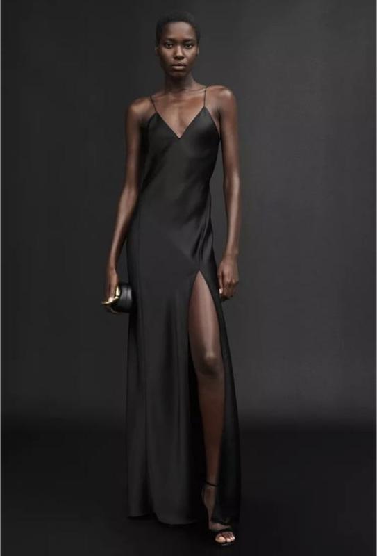Длинное платье из атласной ткани с V-образным вырезом, тонкими бретелями, открытой спиной и боковым разрезом внизу. ЧЕРНЫЙ | 3185/331/800