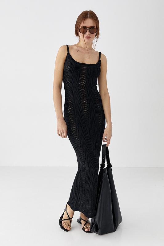 Ажурна літня в'язана сукня на бретелях — це справжня ода легкості та елегантності. Вона чудово підходить для теплих сонячних днів, створюючи романтичний і водночас витончений образ. Така модель поєднує у собі легкість візерунків і комфорт дихаючої текстури в'язки. Сукня має приталений крій, який підкреслює силует і тонкі бретелі, що відкривають плечі. Ажурний візерунок виконаний у формі хвиль, що додає сукні особливого шарму, нагадуючи морські мотиви і легкий бриз. Особливістю цієї сукні є низ, оформлений хвилеподібним краєм, що ніжно коливається при ходьбі, підкреслюючи легкість і витонченість кожного кроку 100% бавовна
